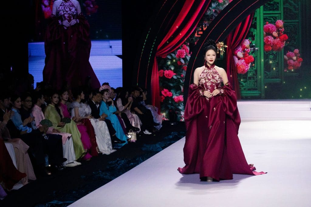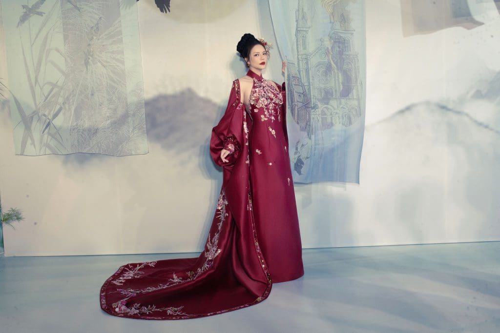 Chỉ trong một thời gian ngắn, chiếc váy hồng ngọt ngào đã được thay thế bằng bộ áo dài cách tân với chi tiết cổ yếm tinh tế – một biểu tượng của sự quyến rũ kín đáo trong văn hóa Việt Nam. Chiếc áo dài cổ yếm đỏ thắm đã phát huy tối đa lợi thế hình thể của cô, khoe khéo bờ vai thon thả và tấm lưng ngọc ngà, nhưng vẫn giữ được sự cao sang, đài các cần thiết cho một sàn diễn thời trang cao cấp.