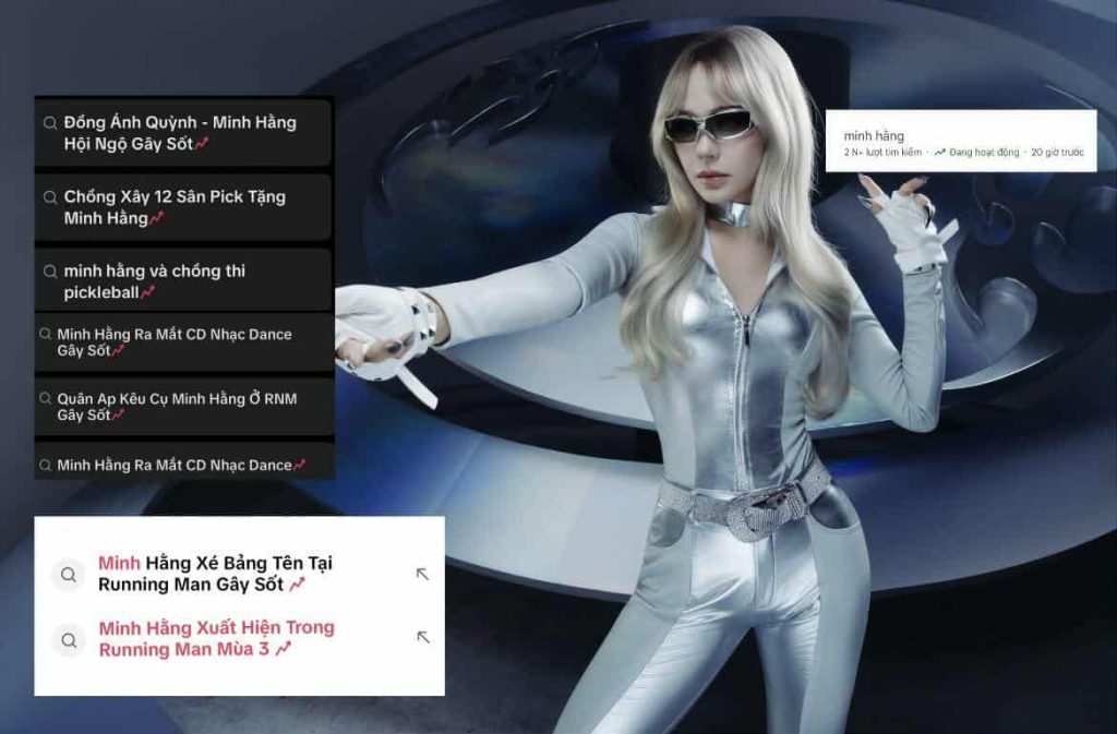 Bên cạnh đó, từ khóa “Minh Hằng” cũng lọt top tìm kiếm Google Trends. Riêng trên nền tảng Tiktok, cái tên Minh Hằng khiến khán giả bất ngờ khi 8 lần lên xu hướng với những tìm kiếm như “Minh Hằng ra mắt CD nhạc dance”, “Minh Hằng ra mắt CD nhạc dance gây sốt”,…