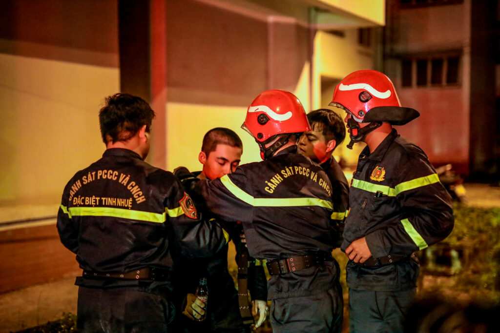 Ngay sau đó, các chiến sĩ nhập vai bước vào buổi huấn luyện cứu nạn cứu hộ trên cao, một trong những kỹ năng nghiệp vụ quan trọng của lực lượng Cảnh sát PCCC & CNCH. Buổi huấn luyện do Thiếu tá Huỳnh Nguyên Thuận, Phó Đội trưởng Đội công tác chữa cháy và cứu nạn cứu hộ, Phòng Cảnh sát PCCC & CNCH, Công an TP.HCM trực tiếp hướng dẫn.